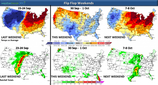 But the progressive flip flop weather pattern will bring the cool weather East and hot again out West before another surge of colder weather moves back to the West. Pick your favorite weekend as they'll be up and down.