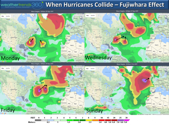 The wt360 wave height forecast maps shows what happens when hurricanes collide...it's called the