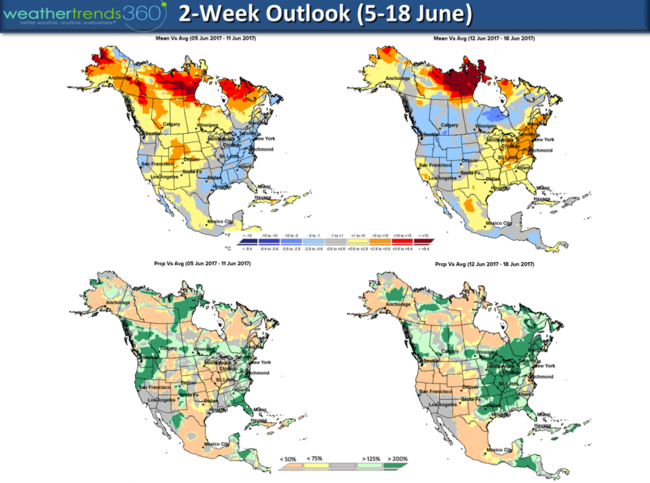 This hotter more Summer-like pattern is expected to continue into 4th of July for the U.S. overall with more warm days than cooler days, a change from the predominantly colder May pattern. But this briefly warmer pattern is likely to turn cooler and wetter again for the later half of July in the East while the Pacific Northwest heats up. We will be sending an Ag update video to farmer customers Thursday.