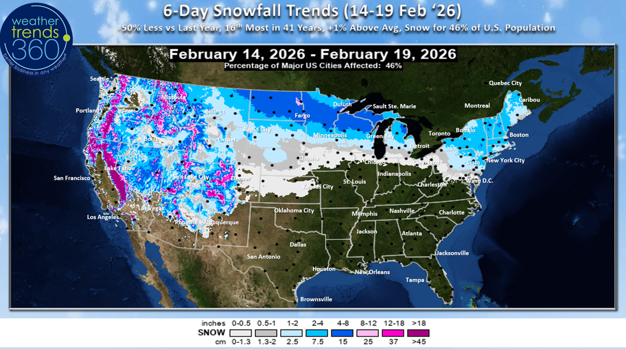 The 6-day snowfall outlook (14-19 Feb) shows -50% less snow vs last year, but still 16th most over the past 41 years with 46% of the U.S. population getting some snow.