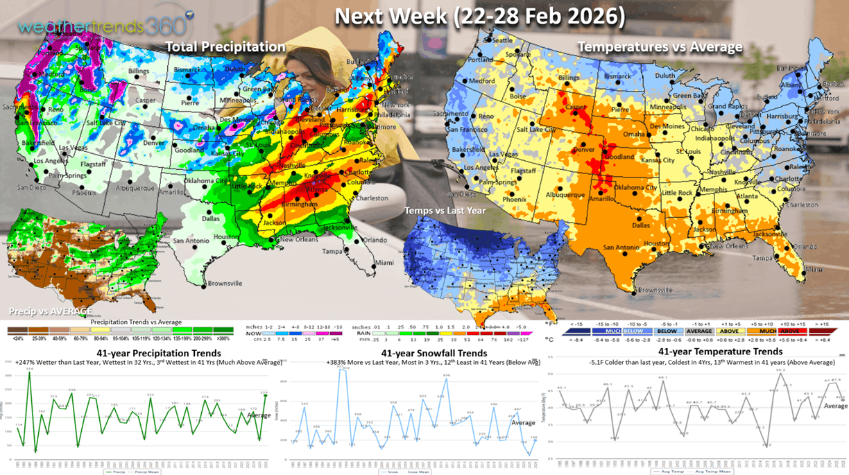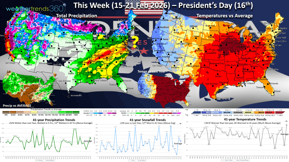 This week (15-21 Feb) President's Day trends a whopping +18.5F warmer than last year and #1 warmest of the past 41 years. Snowfall is down -22% vs last year but still 12th most of the past 41 years and above average, while rainfall is up +42%, wettest in 5 years and 11th wettest in 41 years. This stormier pattern while likely suppress store traffic a bit despite the much milder weather. Warm/Dry is the most ideal weather for seasonal sales and store traffic this time of year, so the Central U.S. is a bright spot.