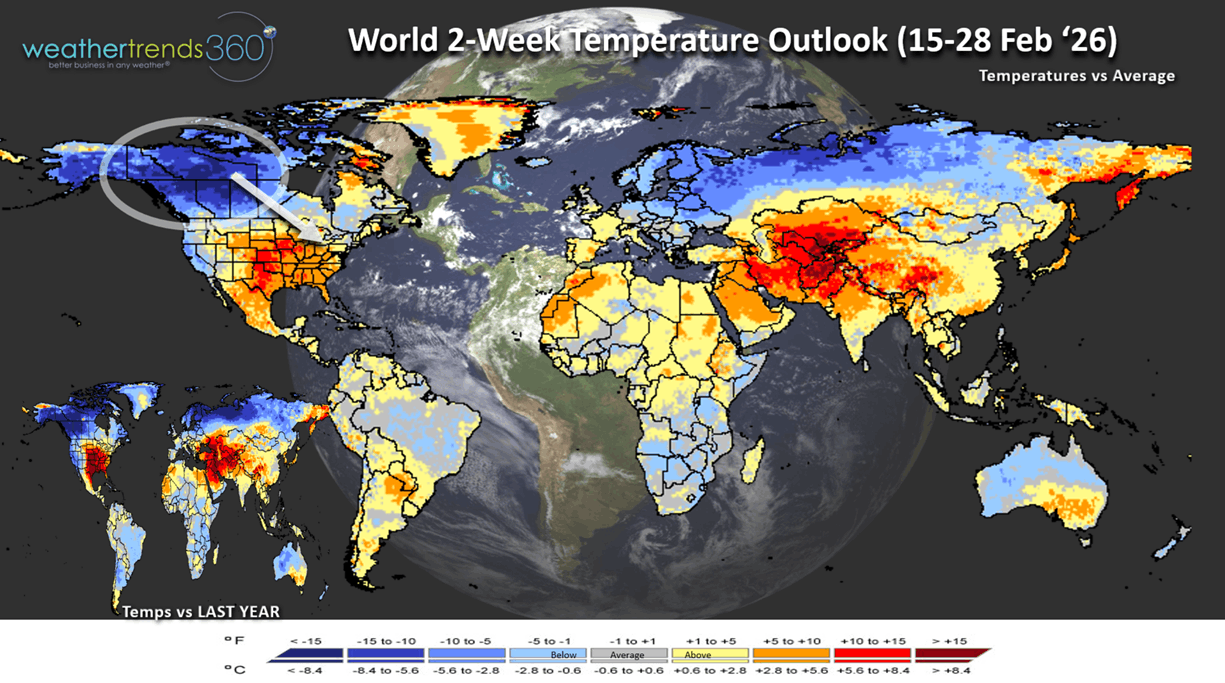 The World 2-week (15-28 Feb) Temperature outlook shows a cross Polar Vortex flow from Siberia into Canada and heading into the U.S. Warm Western Europe, colder Eastern Europe and very hot in the Middle East - Asia.