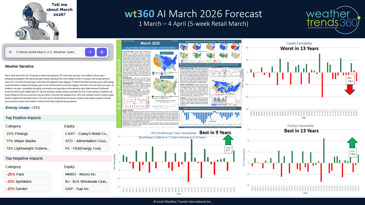 wt360 AI query on our year-ahead March 2026 outlook. Shows a lot of risk for Spring seasonal category sales with areas like the Northeast expected to be the coldest in 7 years, snowiest in 8 years. Garden categories nationally show the worst sales index in 13 years, while First Energy the best in 9 years. A little more valuable information than the not so business friendly NOAA outlooks.