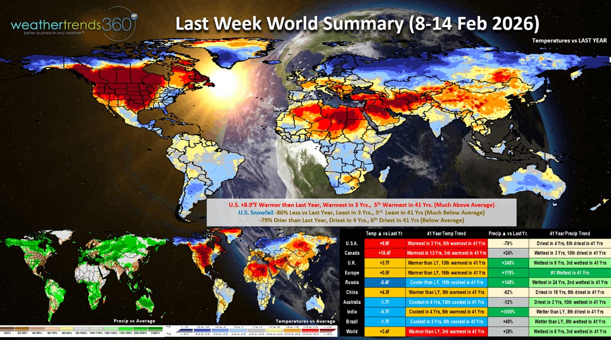 Last week World Summary (8-14 March) shows the U.S. enjoying a much needed "February Thaw" with the country trending +8.9F warmer than last year, warmest in 3 years and 5th warmest of the past 41 years. Snowfall was down -86% vs last year, least in 3 years and 3rd least in 41 years nationally, while rainfall was down -79%, driest in 4 years and 6th driest in 41 years. These are ideal conditions for store traffic with warmer/drier weather better for almost all retail outlets. Europe was warmer but exceptionally wet, a negative for traffic. Brazil continued their transition to a much wetter pattern that's developed over the past few months - good for their crops.