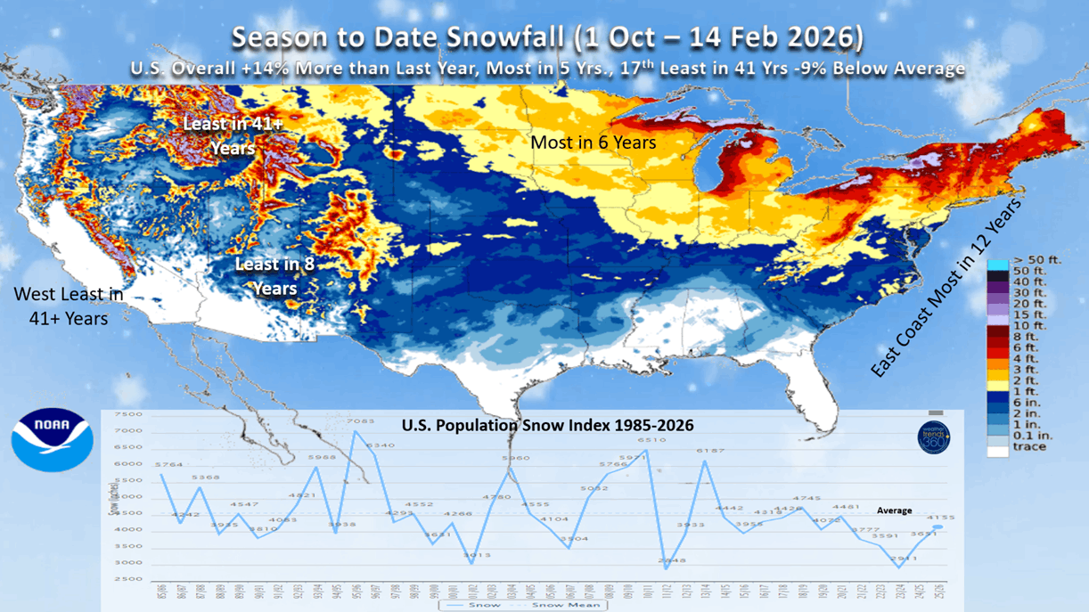 U.S. Season to date snowfall is trending +14% more than last year nationally, most in 5 years, 17th least in 41 years and -9% below average. But the East Coast is much above average, trending the most in 12 years, North Central most in 6 years, while the West is the least in 41+ years.