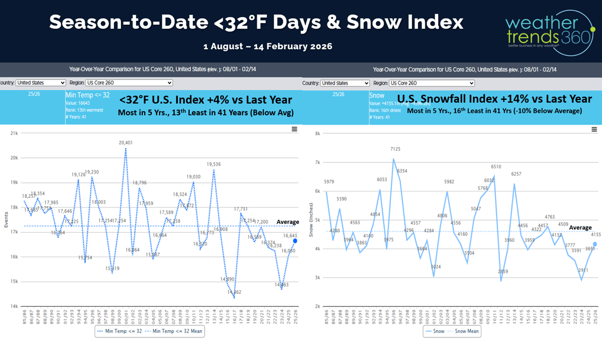 Sub-freezing days across the U.S. are trending +4% more than last year, most in 5 years, but still 13th least in 41 years.