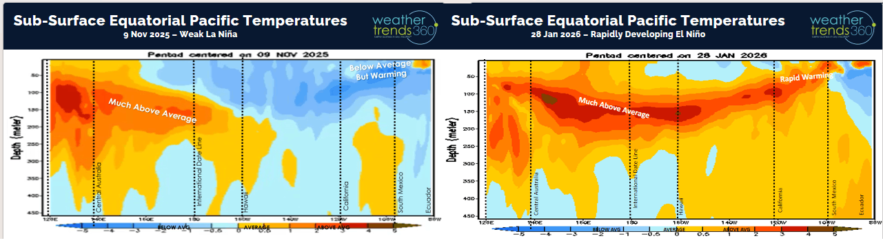 El Niño cycle. The sub-surface ocean temperatures across the Pacific Ocean show a rapid warming cycle indicating a fast onset to El Niño this Spring. Over the past 3 months the sub-surface Pacific Ocean temps have been rapidly warming and spreading to the East Pacific and now bubbling to the surface. This will start to develop a very wet pattern in the U.S. in the months ahead, a pattern already taking shape in Brazil.