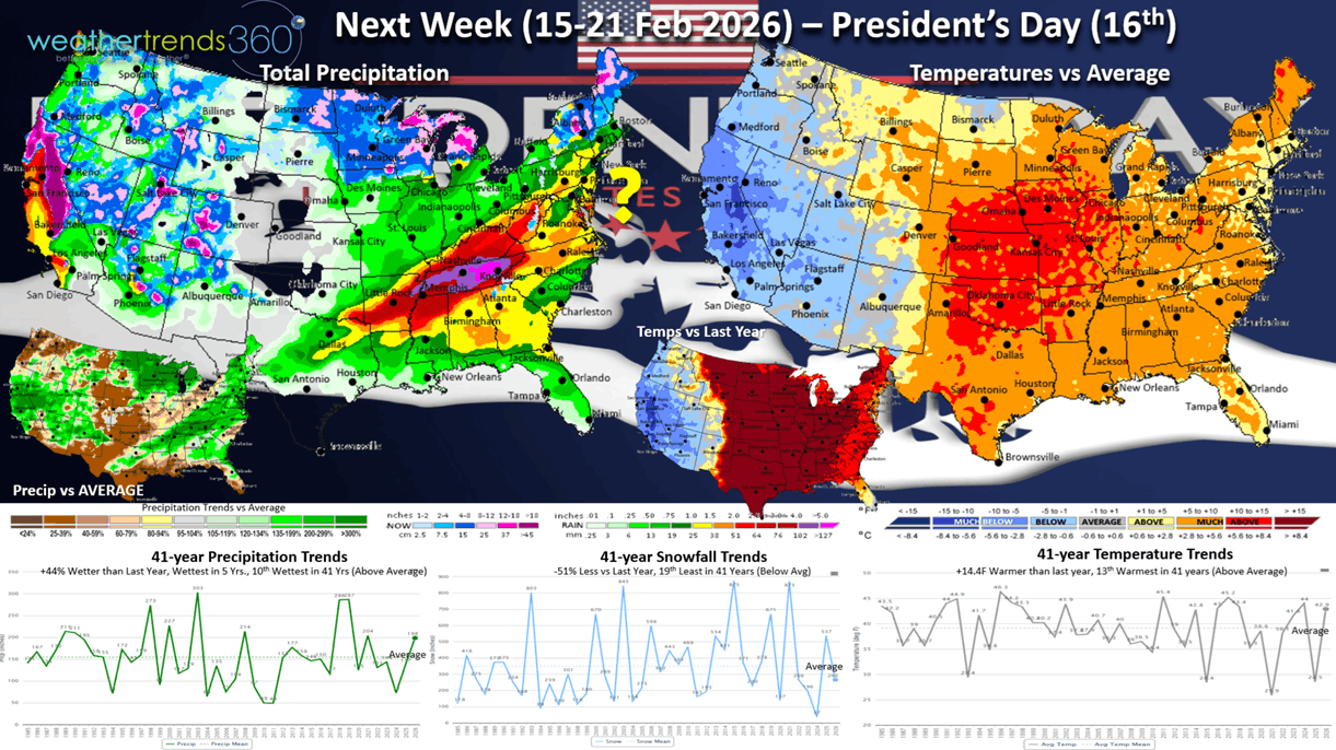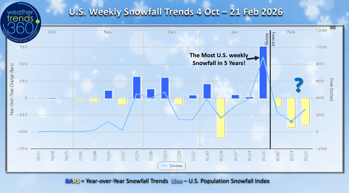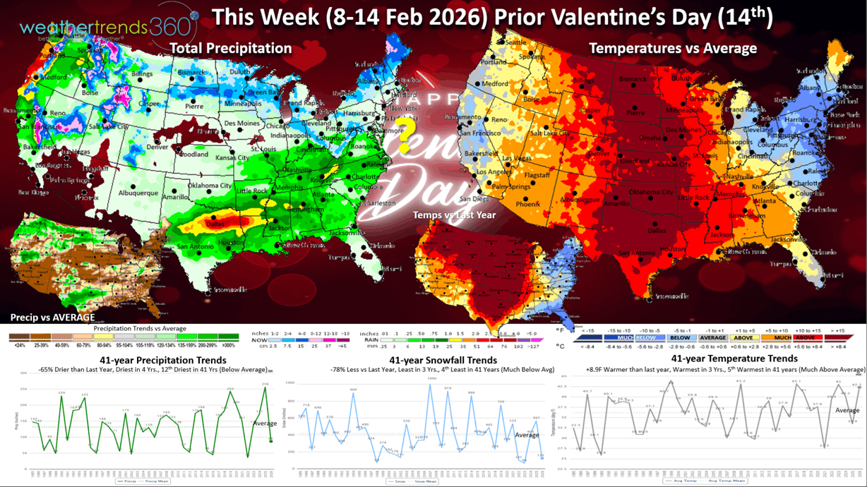 This Valentine's Day week (8-14 Feb) shows a more transient pattern with cold and snow moving into the West, big warm up in the Central U.S. but still cold in the Northeast. The week overall trends +8.9F warmer than last year, warmest in 3 years and 5th warmest of the past 41 years. Snowfall down -78% vs LY, least in 3 years and 4th least in 41 years, while rainfall is down -65%, driest in 4 years and 12th driest in 41 years. These are much more favorable trends for store traffic that took a major hit the past few weeks.