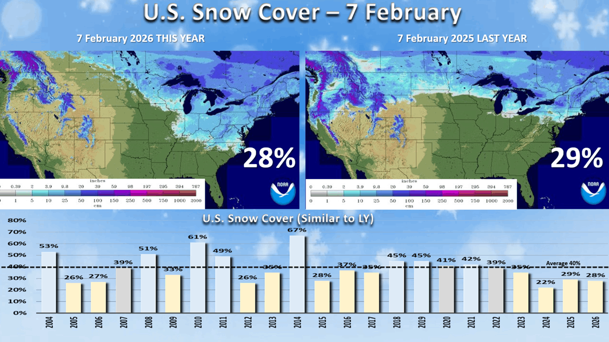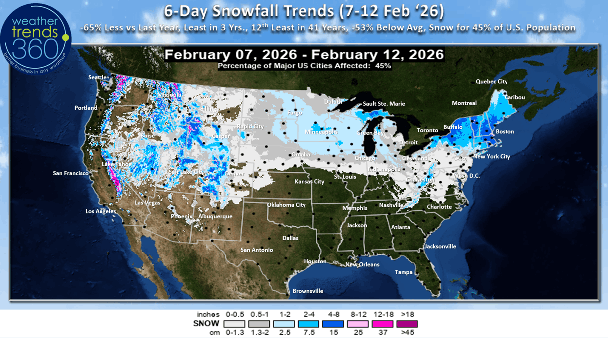 The 6-day snowfall outlook shows 45% of the U.S. getting some light snow, but overall, the least snow for this period in 3 years. TBD if there is a bigger storm developing in the East closer to the Valentine's Day weekend and or the days after.