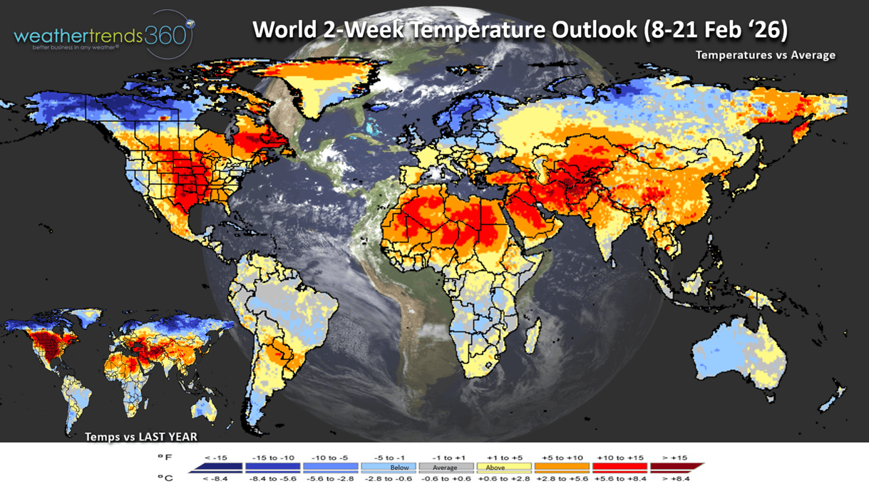 Last Week (1-7 Feb) across the World for the start of Q1 shows the U.S. trending -6.5F colder than last year, coldest in 3 years and 13th coldest of the past 41 years. But it was a tale of two halves with the East Coats trending the coldest in over 41 years with historic 100 year cold in the Southeast. Snowfall was down -47% vs LY, while Rainfall was down -58% and driest in 9 years. These remain unfavorable trends for store traffic East, better with the warmer/drier conditions West. Europe was the coldest in 7 years. It remains very wet in Brazil - great for their crops but could impact harvesting conditions.
