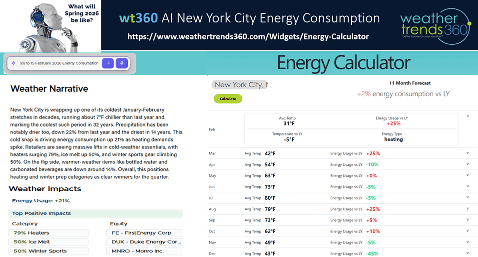wt360 AI robot about how these cold trends will impact energy consumption over the next year. Unfortunately, if you're January utility bill shocked you, February and March will be equally bad with continued overall cold conditions and +25% more consumption in New York City as an example. Try our energy calculator widget for your town: