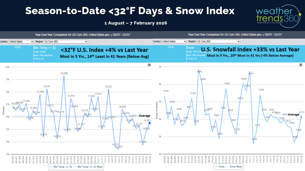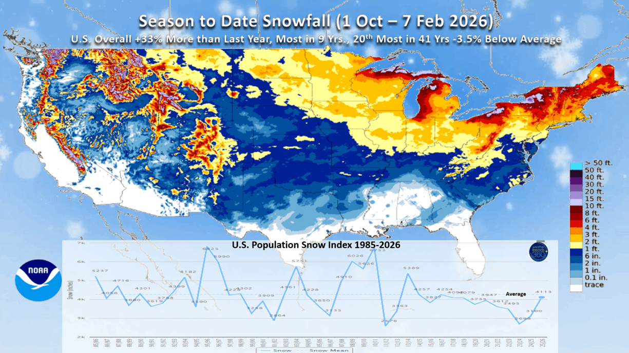 Season-to-date Snowfall is trending +33% more than last year for the U.S. overall, most in 9 years and 20th most of the past 41 years. Most of that is in the East with the Western U.S. trending the least snow in over 41 years.