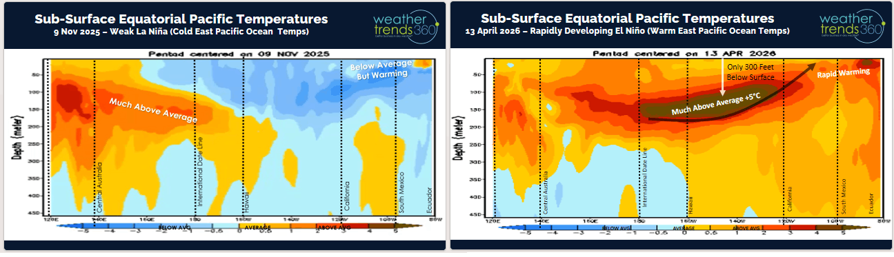 300 feet below the surface of the Equatorial Pacific Ocean to find +5C much above, near historic warm waters percolating to the surface. +2C would be a super El Niño, so this is becoming increasingly likely.
