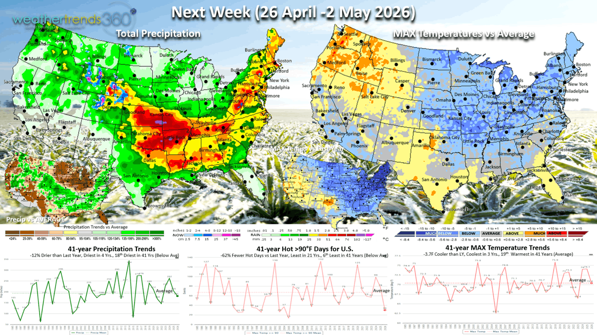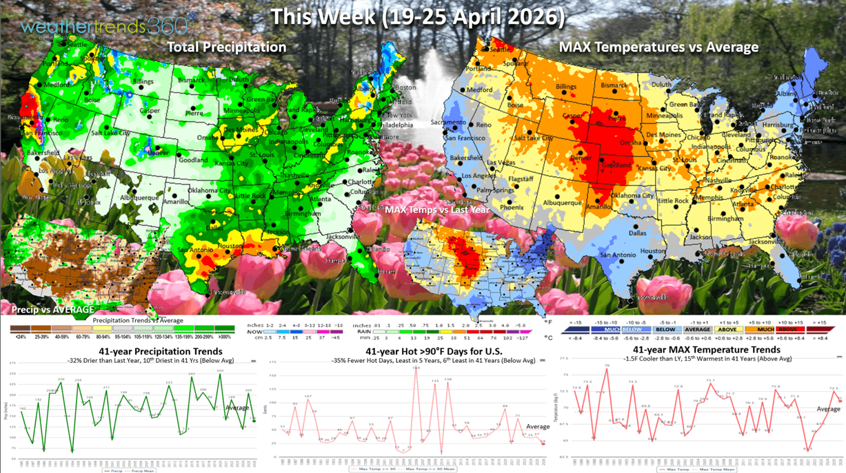 This week (19-25 Apr) shows the big cool down with frost and freezes returning early in the week for the Ohio Valley and Northeast. The heat shifts to the Central Plains, but overall, the U.S. trends -1.5F cooler than last year, but really hot 90F days are down -35% and the least in 5 years. Rainfall down -32% vs LY and 10th driest of the past 41 years. Some softening of demand for Spring seasonal merchandise.