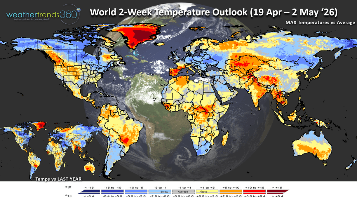 The World 2-week Temperature Outlook (19 Apr - 2 May) shows cooler trends continuing for Canada and The Great Lakes - Northeast, while the West is generally the most favorable area. Western Europe more favorable than Eastern Europe.