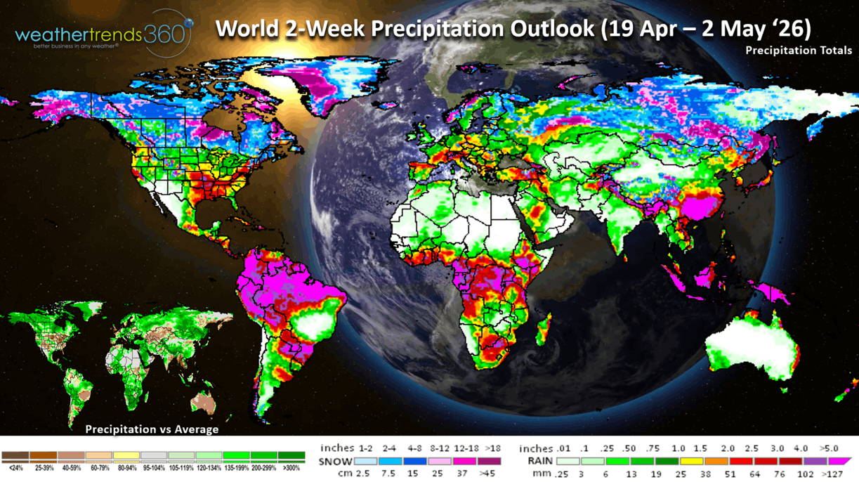 The World 2-week Precipitation Outlook (19 Apr - 2 May) shows some drier weather across Brazil after a wetter pattern the past few months. Europe a bit stormier while Australia turns very dry as the enter middle Fall.