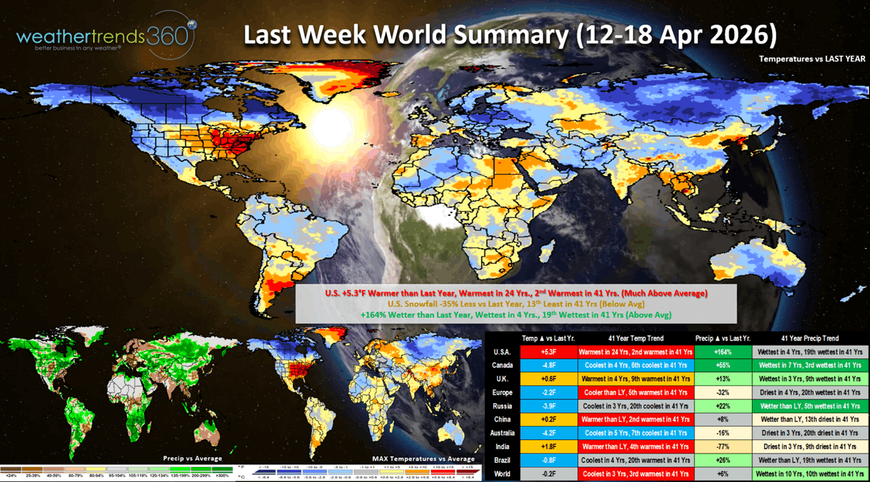 Last week (12-18 Apr) across the World shows the U.S. trending +5.3F warmer than last year, warmest in 24 years and 2nd warmest in 41 years. Rainfall was way up +164% vs LY, most in 4 years and 19th most in 41 years, while snowfall was down -35% vs LY. The rain had a dampening impact on store traffic, but overall, a stronger week for seasonal category sales. Canada remained the cool and snowy spot with a delayed Spring, while the U.K. and Western Europe were generally favorable.