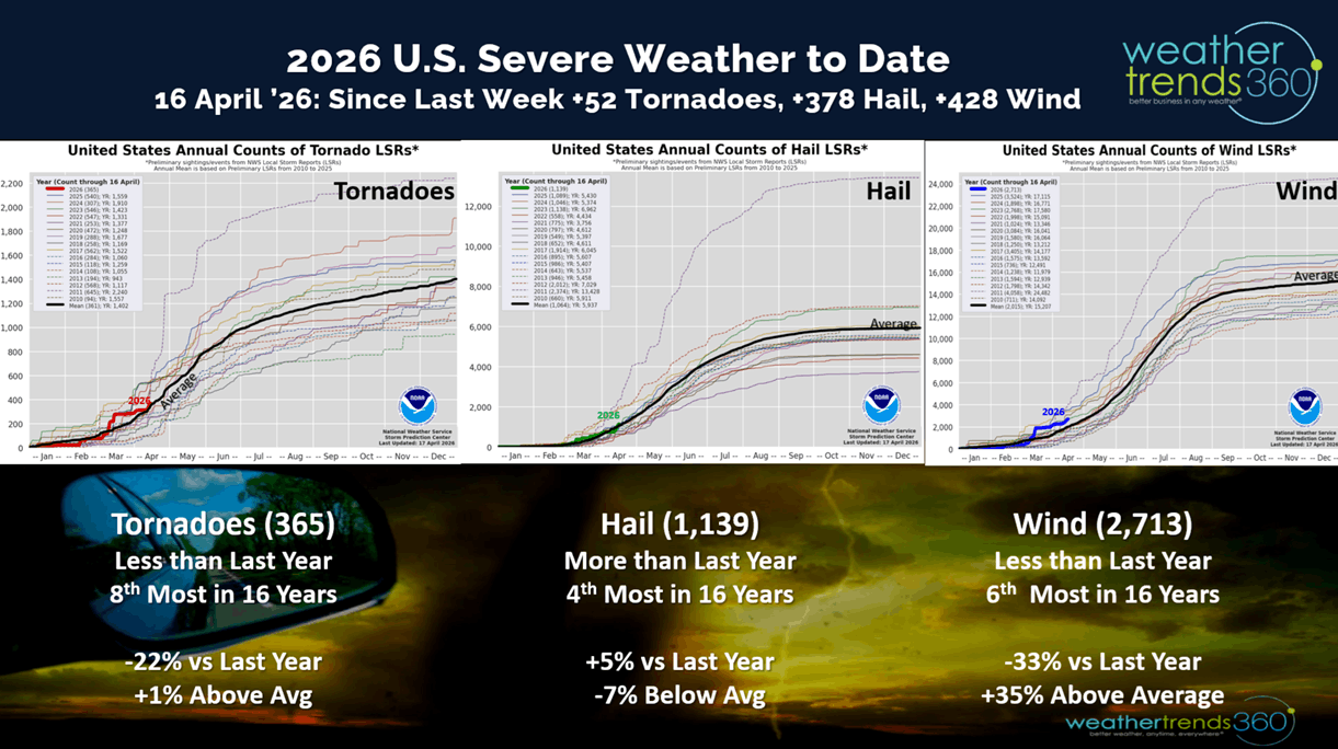 Severe weather to date shows an uptick in activity this past week with 52 tornadoes, 378 hail events and 428 wind cases. Hail is the only category trending above last year, which got off to a faster start than this year.