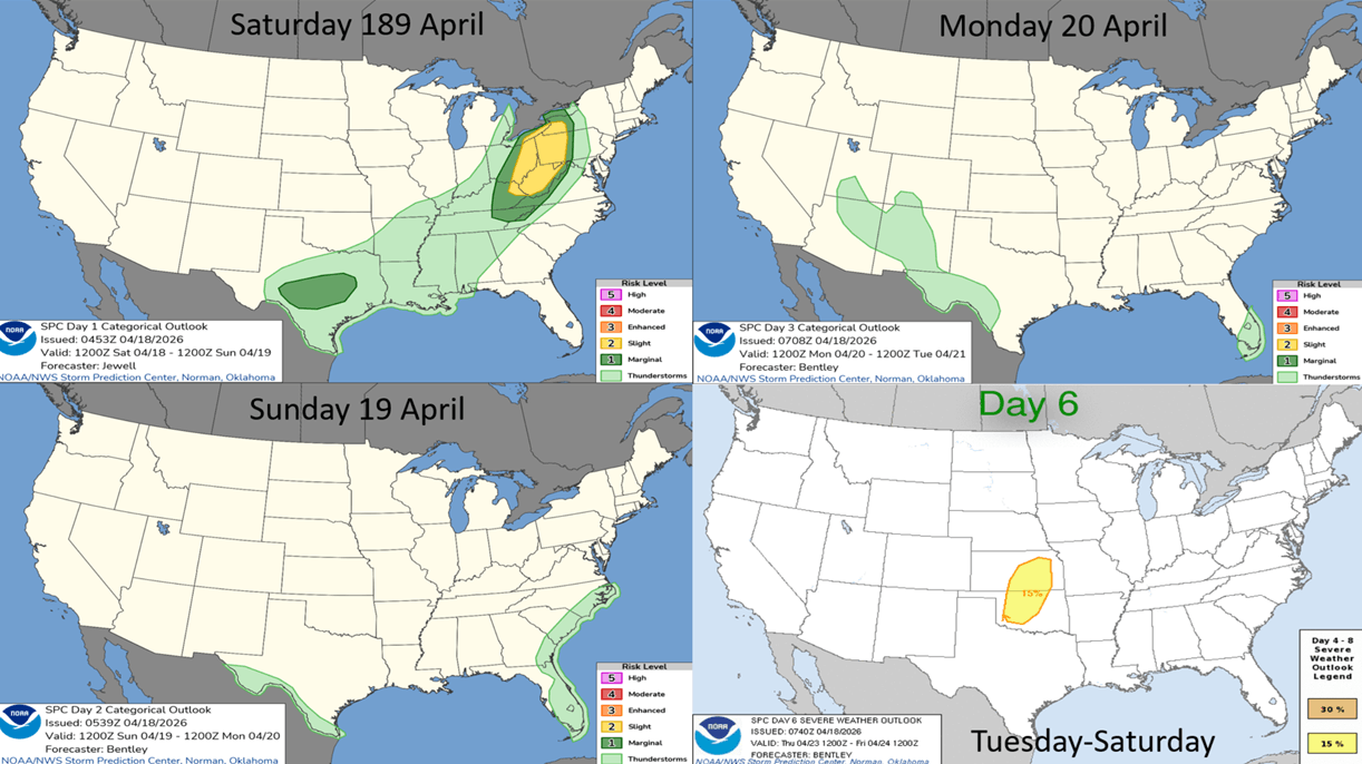 The week ahead severe weather outlook shows some activity continuing today in the Ohio Valley, but then a lull in activity until later next week.