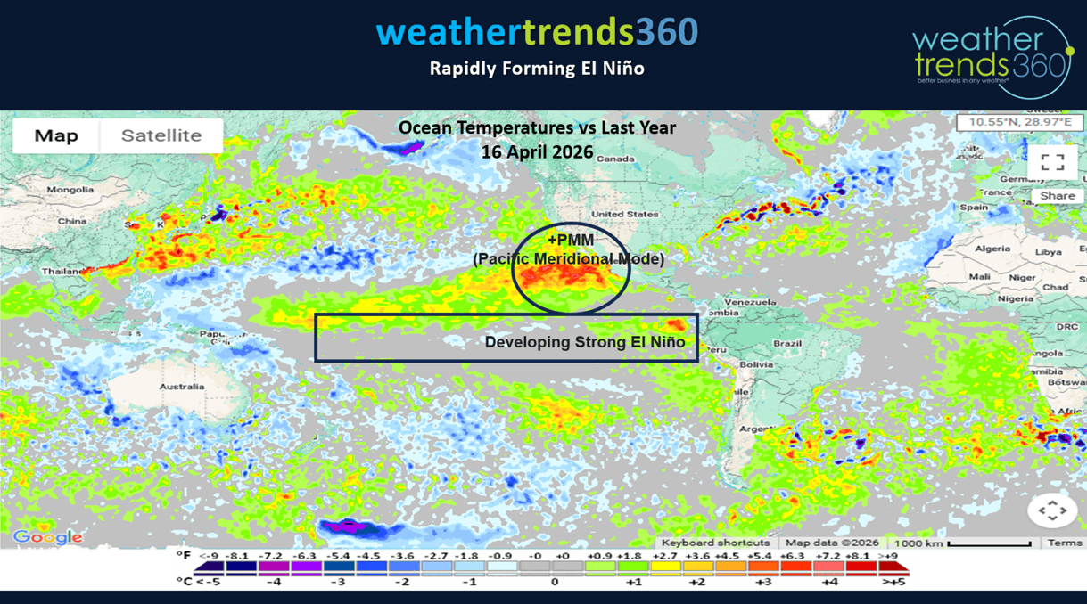 There's a lot of buzz on what could become a very strong El Niño and it could happen very quickly this Summer. The very positive +PMM (Pacific Meridional Mode) is at near record levels, and this could be one factor to rapidly intensify the pending El Niño.