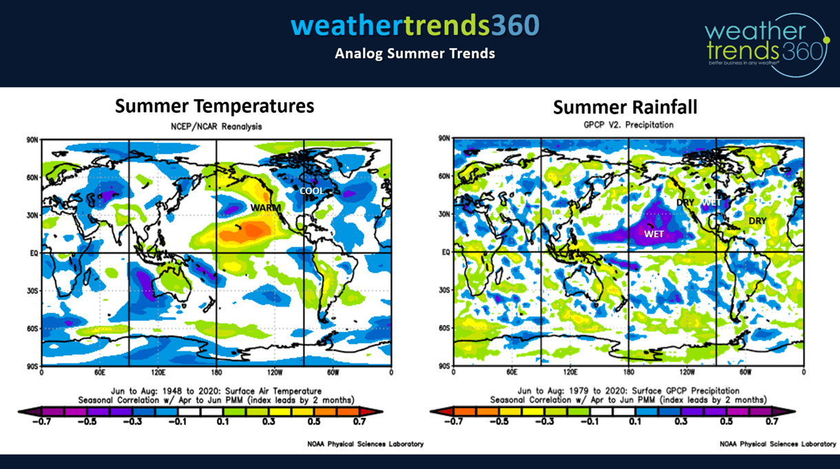 analog weather forecasts based on similar climate cycles in the past, but they do agree with wt360's year-ahead forecast of a much cooler and much wetter Summer pattern in the U.S. and Eastern Canada. The West warmer/drier, while Hawaii continues to get big storms. wt360 is projecting the wettest core Summer-Fall in 5, maybe 8 years for the U.S. overall.
