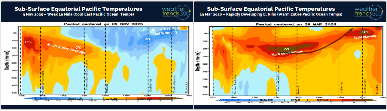 ub-surface Equatorial Pacific Ocean temperatures that show sub-surface ocean temperatures +5C above average. This is the reason there is some buzz, maybe too much at this stage of a Super El Niño...TBD!