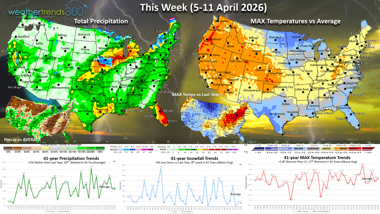 This week (5-11 Apr) across the U.S. shows a continued up and down pattern with bursts of very warm weather followed by a few days of colder weather. Overall the week trends +1.8F warmer than last year for the U.S. overall and 17th warmest of the past 41 years, so not as extreme as last week. Much colder in the North Central U.S. Rainfall up +1% with some much needed rain in the West.