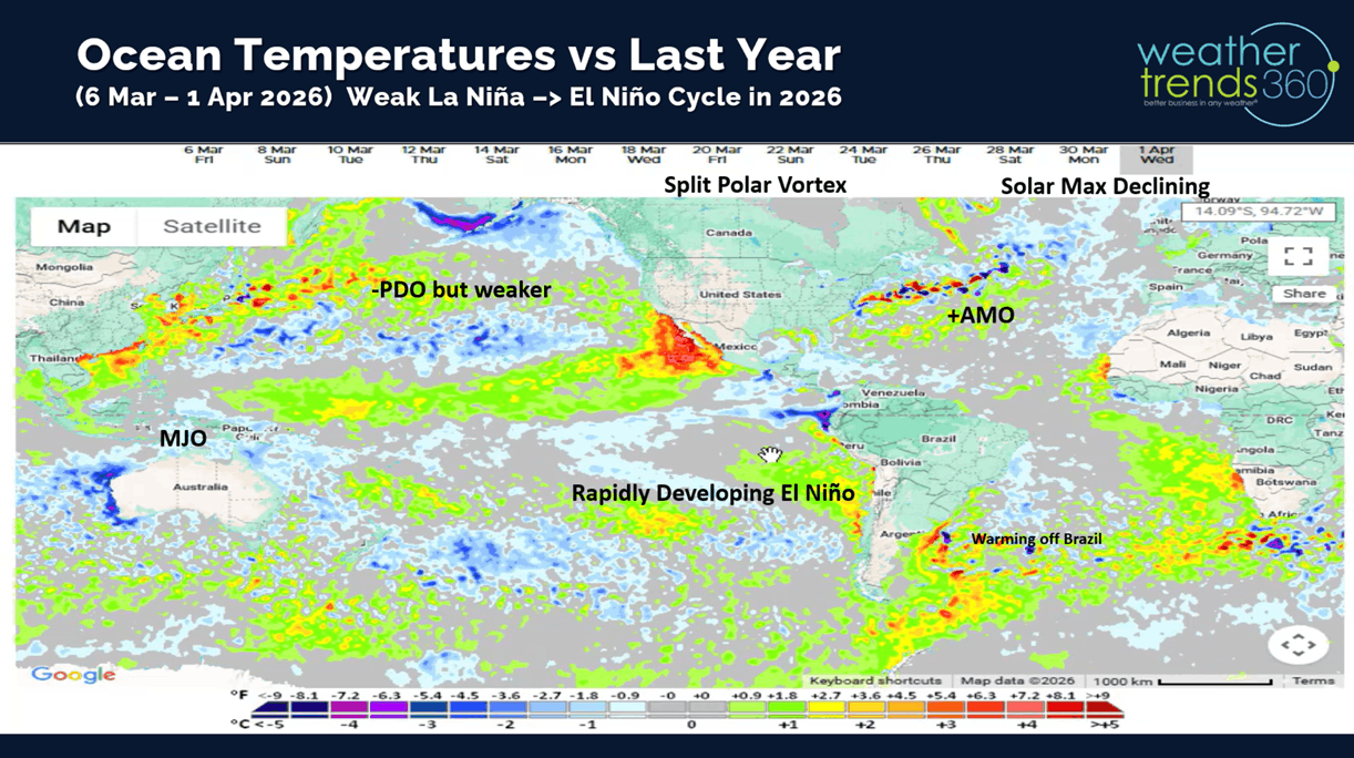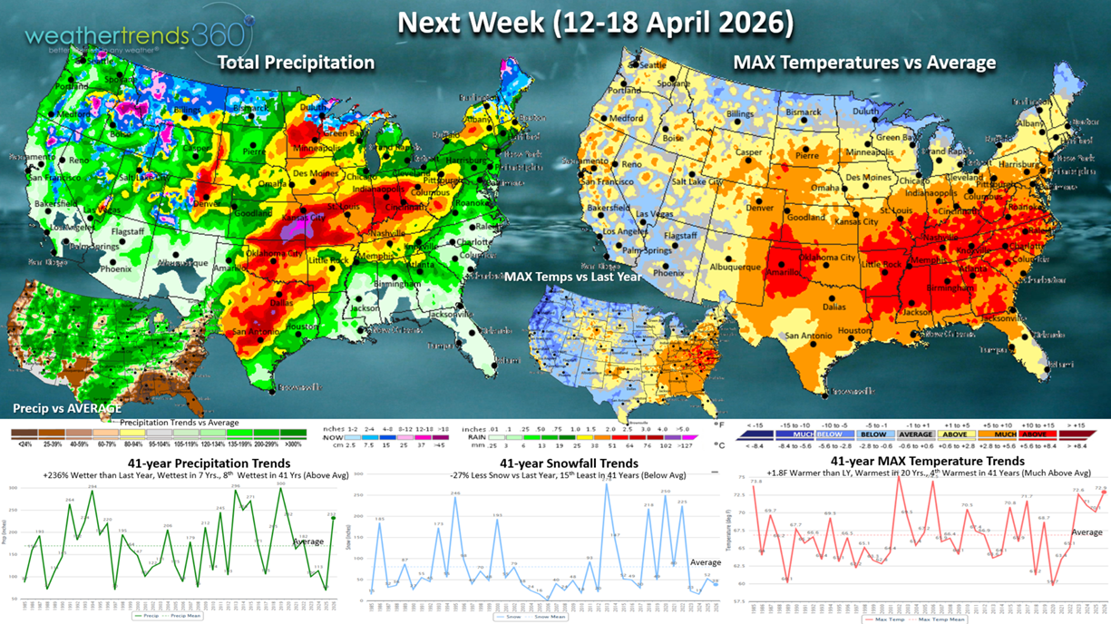 Next week (12-18 Apr) shows the heart of the warm weather shifting into the Southeast and some moderation in the West. The U.S. overall trends +1.8F warmer than last year, warmest in 20 years and 4th warmest in 41 years. Snowfall down -27% vs LY with snow mainly confined to the higher elevations of the Rockies. Rainfall way up +236% vs last year, wettest in 7 years and 8th wettest in 41 years. This is starting to show signs of the developing El Nino like pattern which will become increasingly wetter this Summer and Fall.
