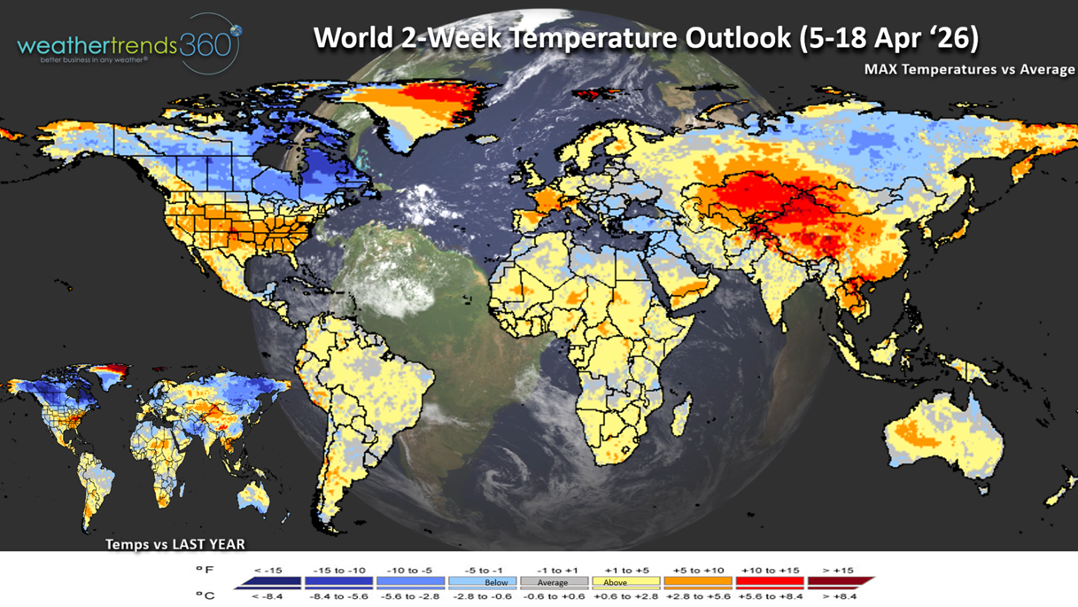World 2-week Temperature Outlook (5-18 Apr) shows continued warm weather in the U.S. while the cold weather stays bottled up in Canada. Central Europe and the U.K. is favorably warm, with cool conditions in the Middle East.