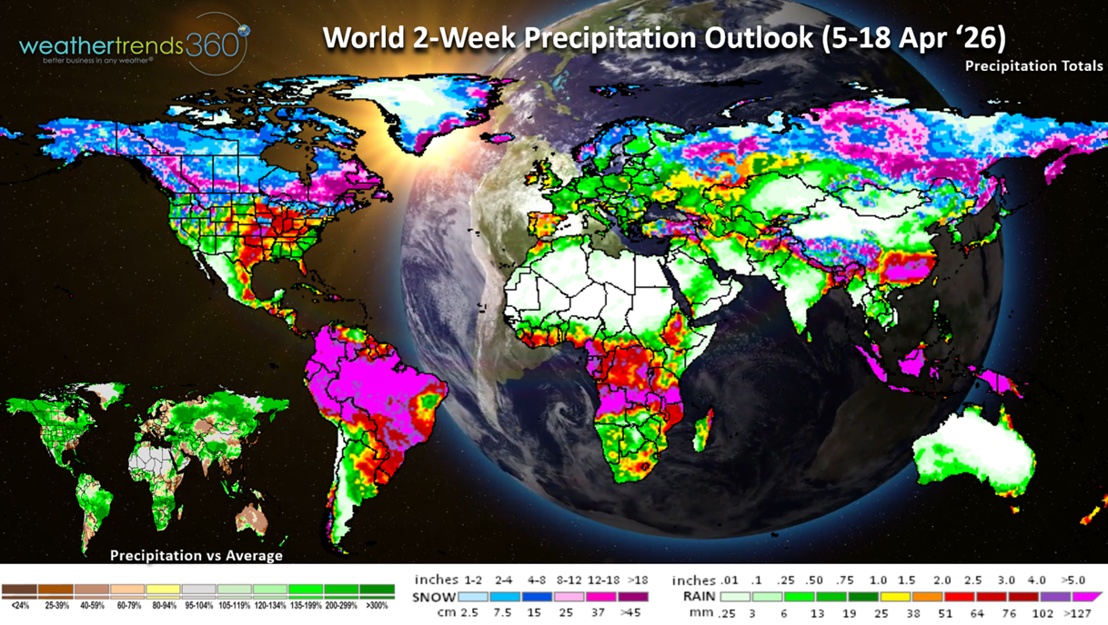 World 2-week Precipitation Outlook (5-18 Apr) shows the stormier pattern across much of the U.S. with the Southeast remaining generally dry with expanding drought in that region. Continued very wet across Brazil benefiting their second crop which should bring near record yields.
