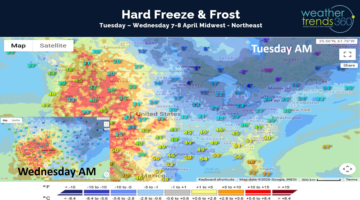 Widespread frost and hard freezes likely in these areas which will impact vegetation that has emerged too early due to the recent warm weather. Tuesday-Wednesday mornings will be the coldest days this week.