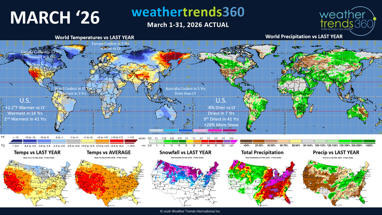 March 2026 shows the month trending +2.2F warmer than last year nationally, warmest in 14 years and 2nd warmest in 41 years. Very unusual because Canada was the coldest in 12 years and snowiest in 9 years. Rainfall was down -8% vs last year in the U.S., driest in 7 years and 9th driest in 41 years, while snowfall was up +28% vs last year.