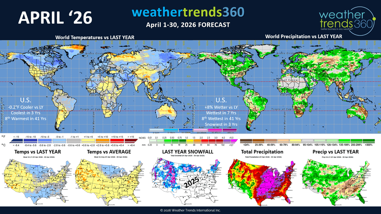 April 2026 shows the West remaining the warm spot with the North Central U.S. the cooler spot. Overall U.S. trends show temperatures slightly cooler -0.2F vs last year, coolest in 3 years, while rainfall is up +8% vs last year, wettest in 7 years and snowiest in 3 years.