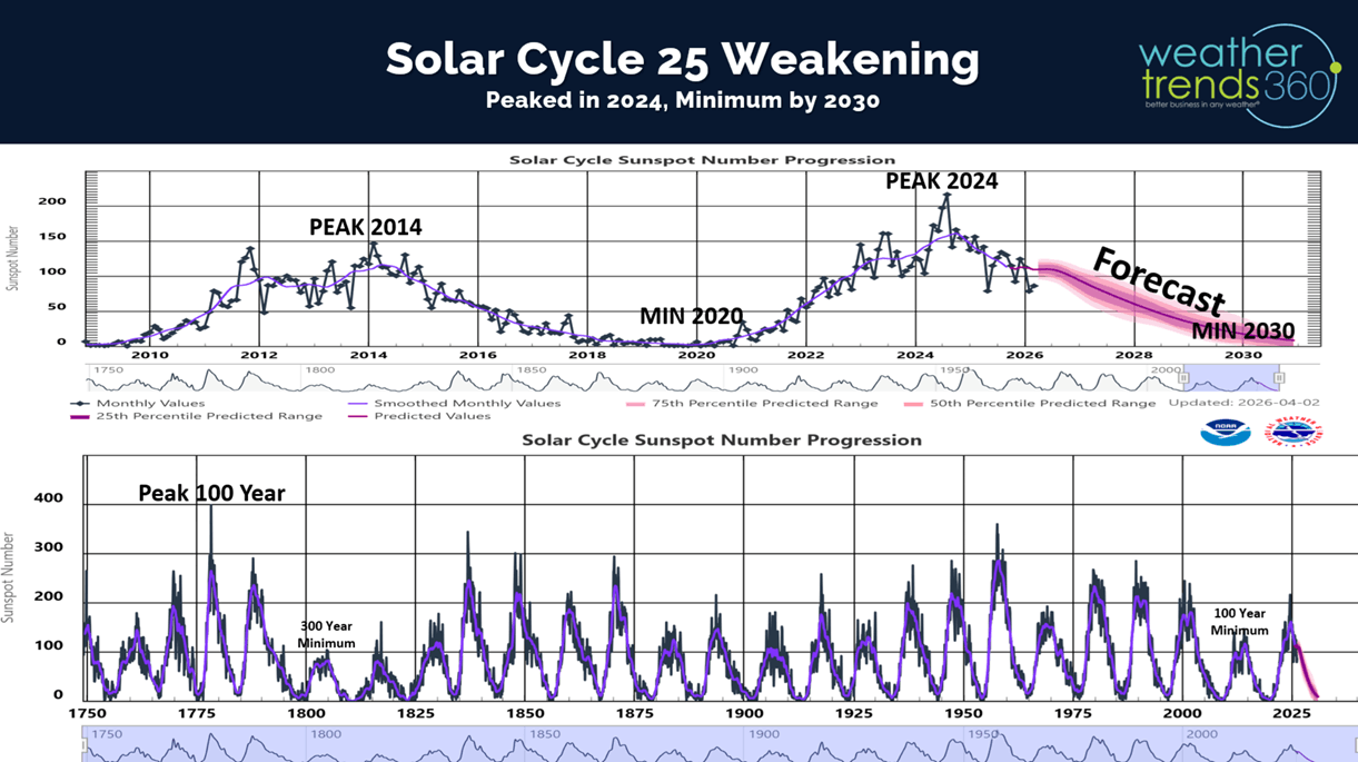 Solar Cycle 25 that has clearly peaked (2024) and now headed toward a Solar Minimum Cycle by 2030. Not uncommon after Solar Peaks to have warming oceans and wetter years. Despite the active Cycle 25, it was nowhere near as strong as the near record year in the late 1950s or way back in 1775.