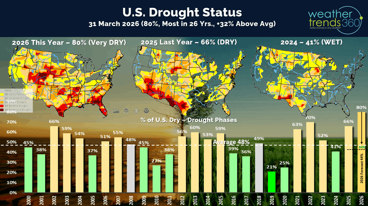 Currently a near record 80% of the U.S is in dry to drought phases, but already seeing signs that cycle is breaking down with April likely to start the wettest in 35 years.