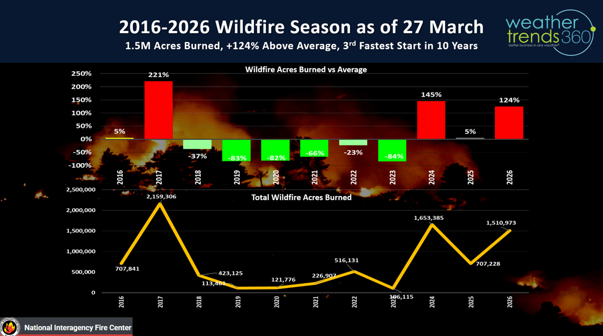 wildfire acres burned are off to a very fast start trending +124% above average with 1.5M acres already burned this year. This will be a very common theme all Summer in the West until the El Niño rains quick in late Fall in the West.