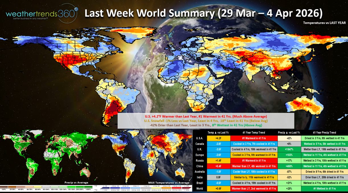 Last week (29 Mar - 4 Apr) across the World shows the U.S. trending +4.2F warmer than last year and #1 warmest in 41 years. Snowfall was -1% vs LY, least in 4 years, while rainfall was -42% drier than LY, least in 3 years, but still 8th wettest of the past 41 years. These are favorable trends for seasonal sales and store traffic, but the wet weather was a dampening factor in the Central U.S. and Northeast, the Southeast remains very dry. Canada continued to stay cold - 7th coldest in 41 years, while China was the hot spot trending 4th warmest in 41 years. Continued cool and wet in Brazil benefiting their 2nd season crops.
