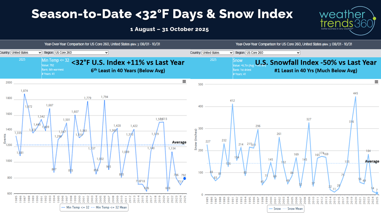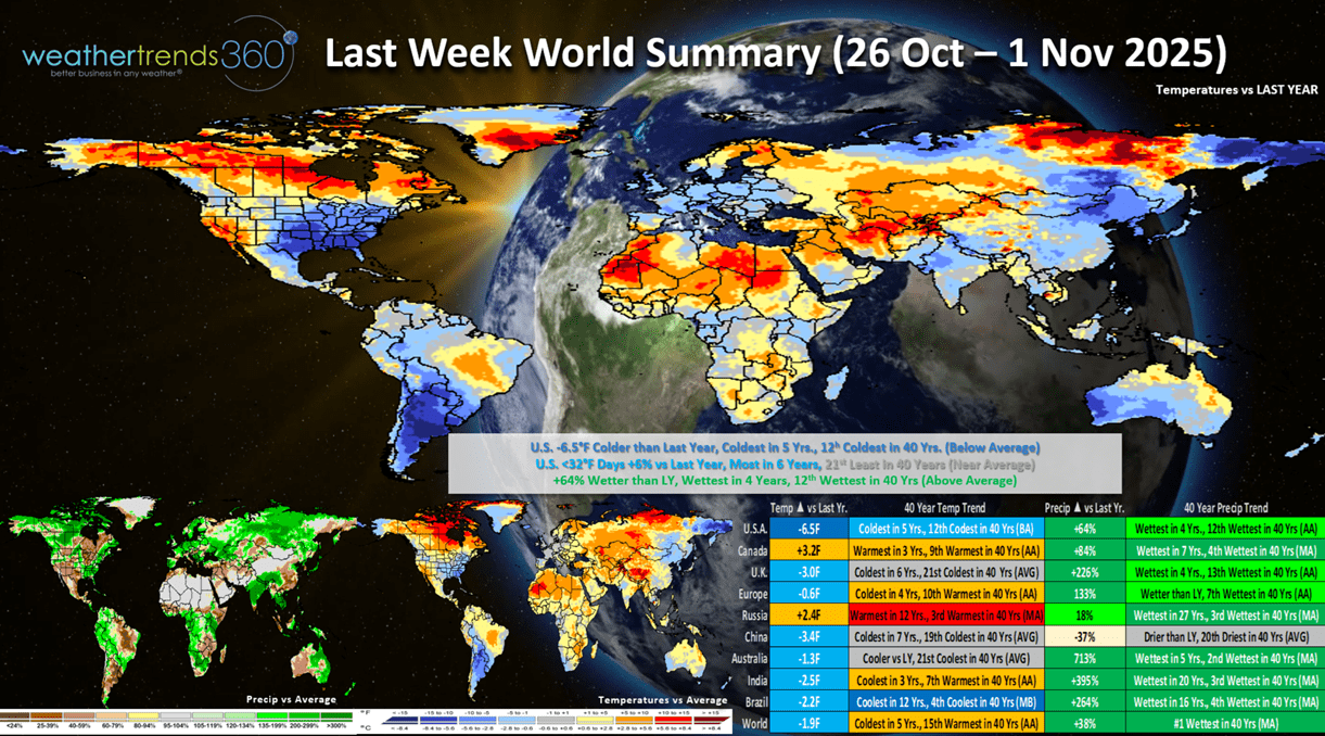 Last week (26 Oct - 1 Nov) across the World was a strong end to Q3 for many retailers and suppliers with favorable weather trends in the U.S., U.K., Europe and Asia. This time of year, colder/wetter weather year-over-year drives higher demand for Fall seasonal merchandise. The U.S. was a very significant -6.5F colder than last year, coldest in 5 years and 12th coldest in 40 years (below average) with the Eastern half of the U.S. exceptional. Cold days below 32F were up +6%, most in 6 years and 21st least in 40 years (average), while national rainfall was up +64%, wettest in 4 years and 12th wettest in 40 years. Europe was the coldest in 4 years, U.K. coldest in 6 years benefiting those areas as well.