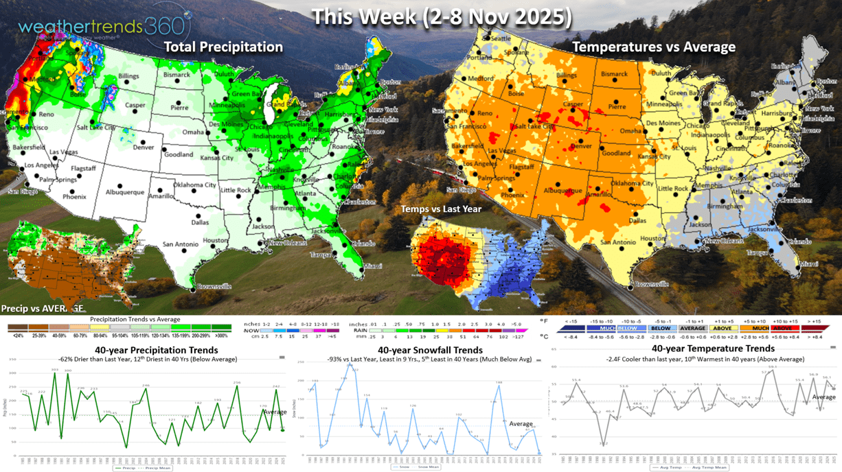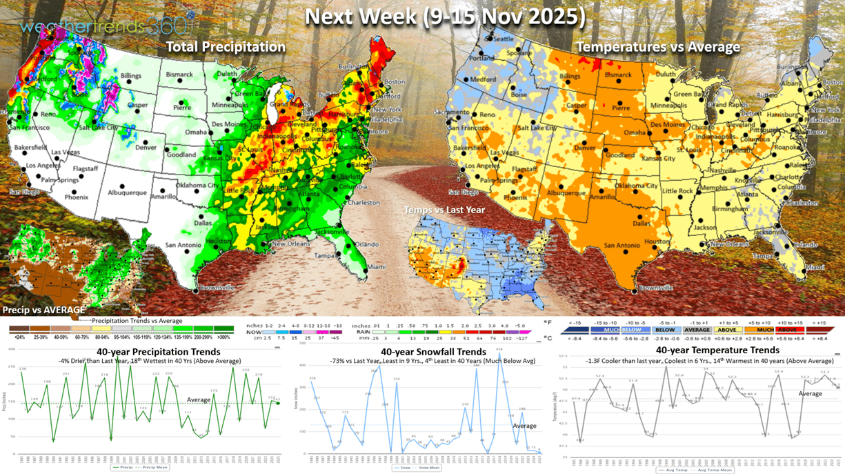 Next week (9-15 Nov) show the U.S. again trending -1.3F cooler than last year, coolest in 6 years but still 14th warmest of the past 40 years. Rainfall is similar to last year but heavier in the Midwest-Northeast and again in the Pacific Northwest where flooding is very possible.