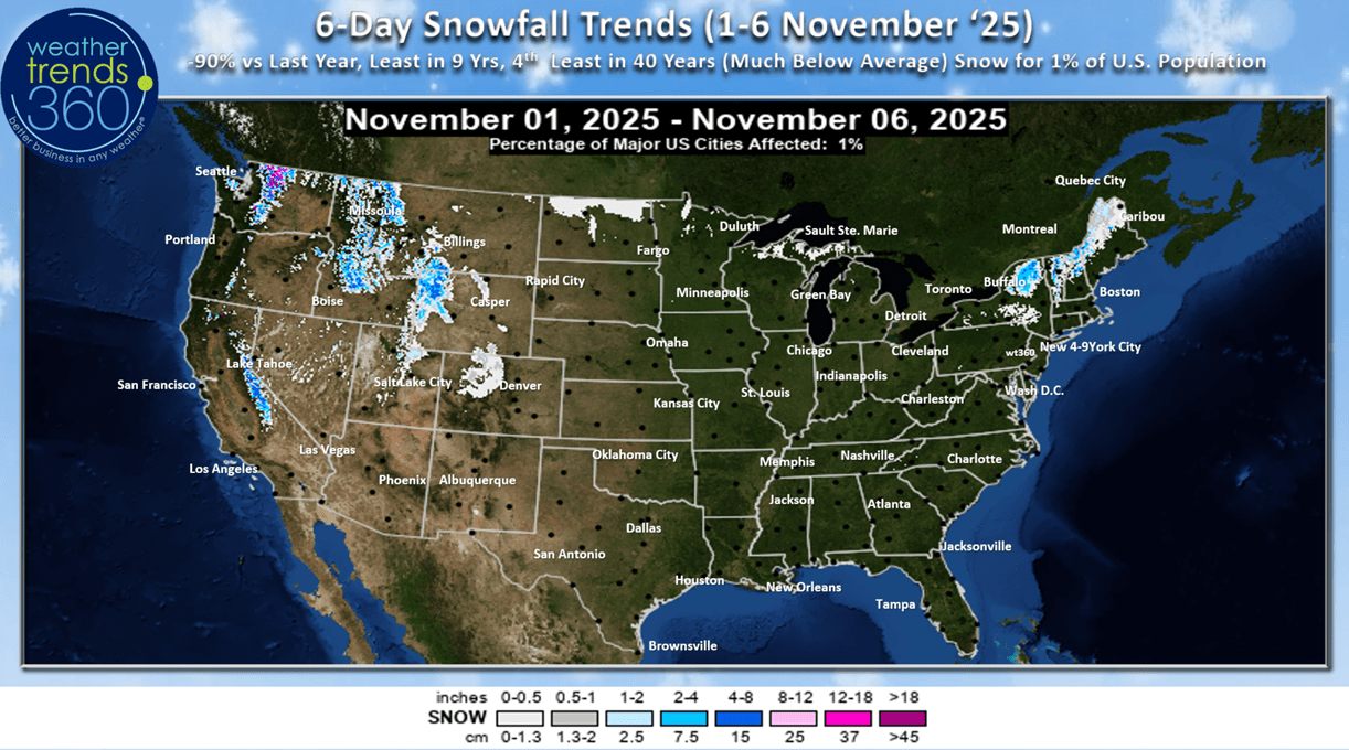 The 6-day snowfall outlook (1-6 Nov) shows the season's first snows for New England, but national snowfall down -90% vs the same period last year and least in 9 years.