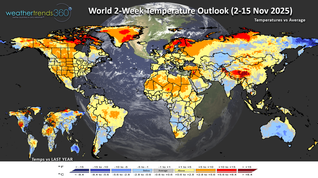 The World (2-15 Nov) Temperature outlook shows the U.S., U.K. and Europe moderating a bit from the recent cold conditions.