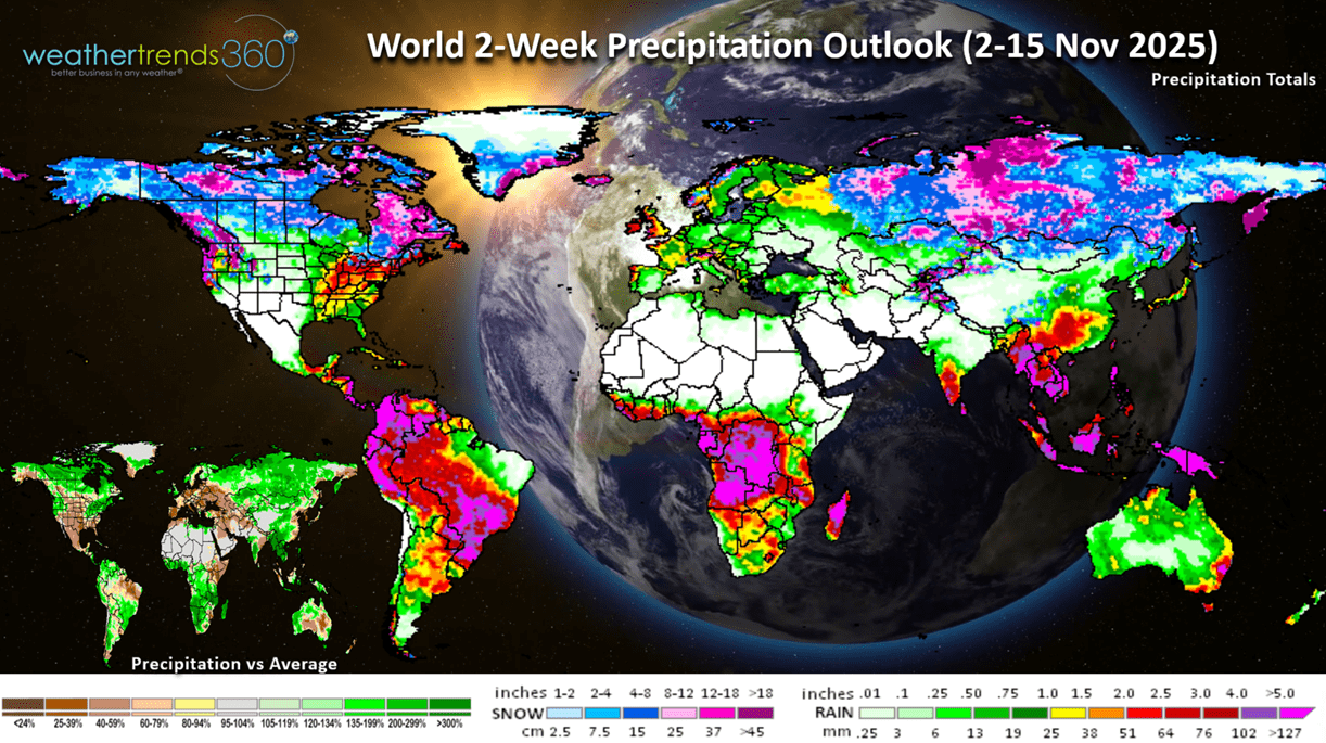The World (2-15 Nov) Precipitation outlook shows a wetter pattern for the drought areas of the Northeast U.S., wet across the U.K. but very dry across Europe benefiting store traffic. Very wet across Brazil's crop growing regions which is very likely going to lead to another record Corn/Soybean crop which will lower these commodity prices by Spring 2026.