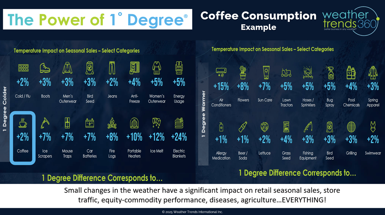 Today's example is Coffee consumption. Every 1 degree colder year-over-year there is a 2% increase in coffee consumption or sales, 10F colder 20% increase. There is a downside that is not always linear, but in this case 10F warmer is a 20% decline in consumption. As humans, we react to our environment with the weather being one big factor in our buying behavior.