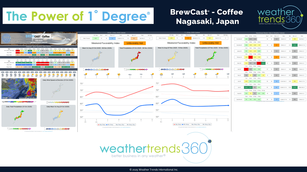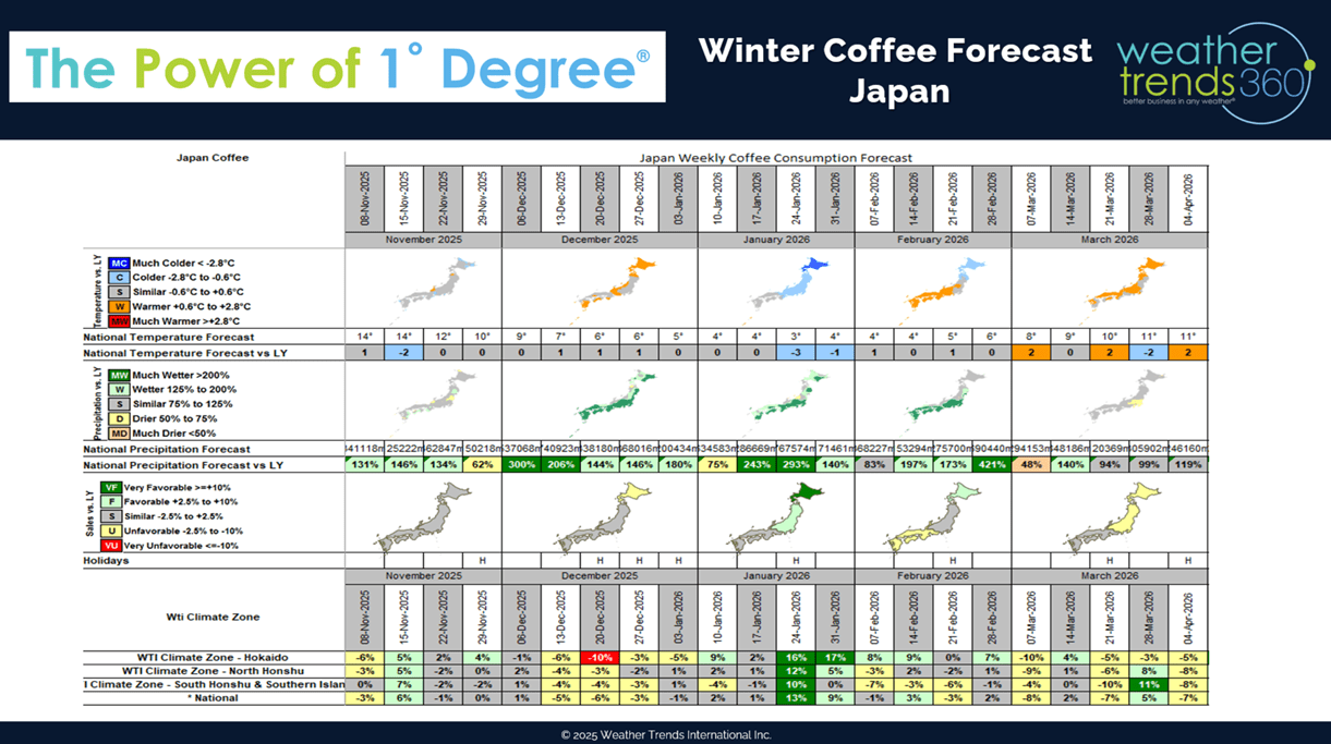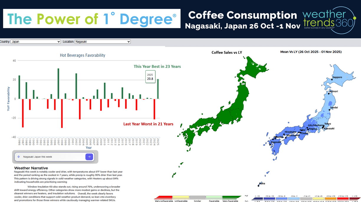 This past week in Japan it was the coldest in 7 years and 95% drier than the previous years which increase store traffic and high demand for hot coffee. Nagasaki, Japan as an example