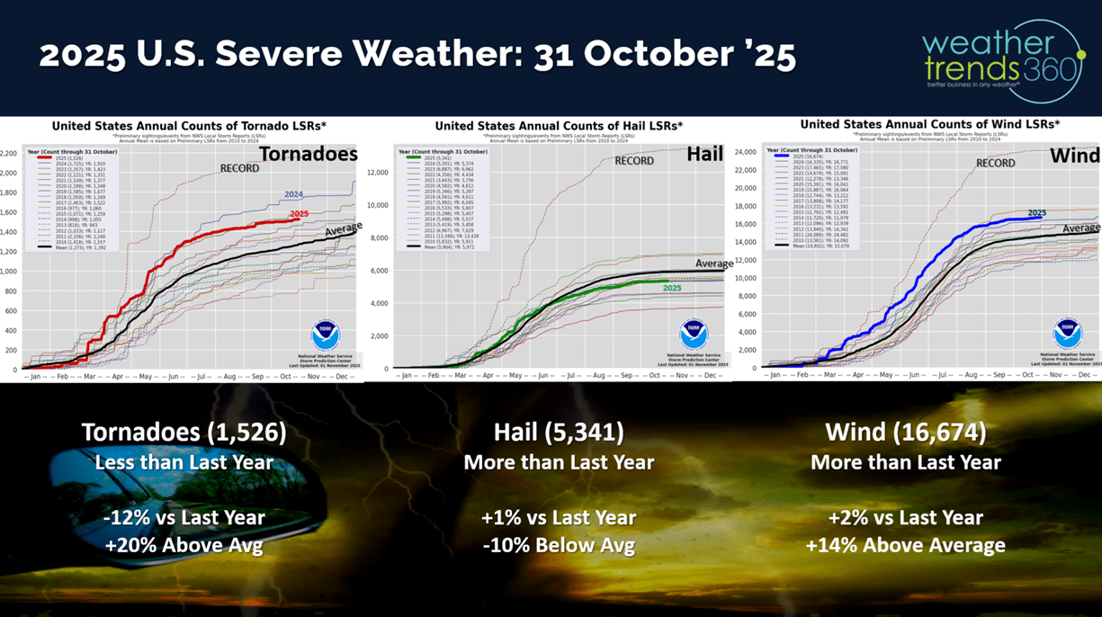 Severe weather to date across the U.S. shows Tornadoes down -12% vs last year, hail up +1% vs last year and wind cases up +2% vs a year ago.