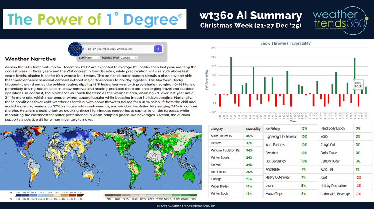 Our Power of 1 Degree AI feature today is Christmas week 21-27 December forecast. December looks to bring a couple shots of the Polar Vortex with a significant event sweeping the U.S. late month. This will benefit seasonal category sales, but likely disruptive to the last few days of the holiday shopping season.