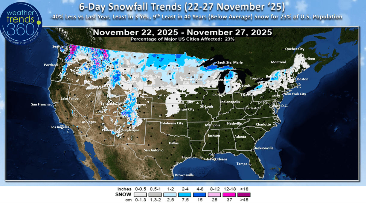 The 6-day snowfall outlook (22-27 Nov) prior to Thanksgiving shows 23% of the U.S. population getting some light snow (mainly the norther tier of the U.S.), but -40% less than a year ago and least in 3 years.