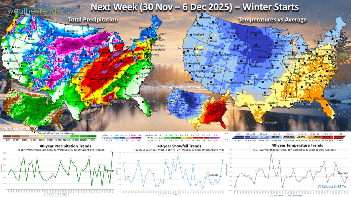 Next week (30 Nov - 6 Dec) shows signs of the Polar Vortex slipping into the U.S. starting in the Plains and heading East late in the week. Warm out in front of this front. The U.S. overall trends +3.1F warmer than last year which was brutally cold (coldest in 22 years), but national temperatures still trend below average. Snowfall is again way up +136% vs LY, most in 18 years and 2