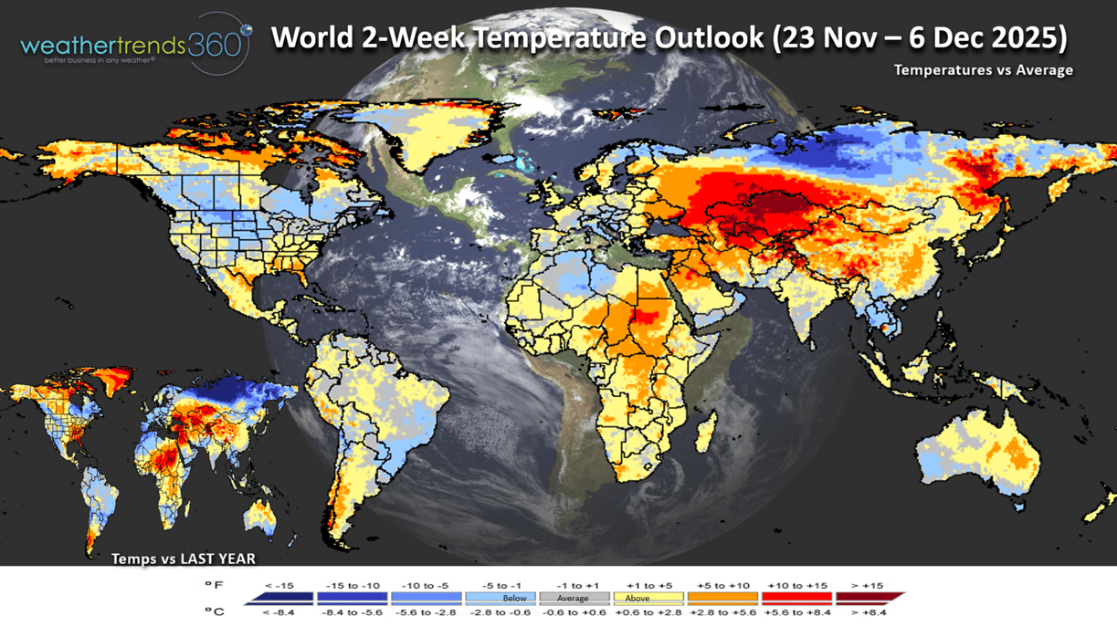The World 2-week Temperature Outlook (23 Nov - 6 Dec) shows colder weather returning to Canada and eventually most of the U.S. late in the period. Milder across the U.K.