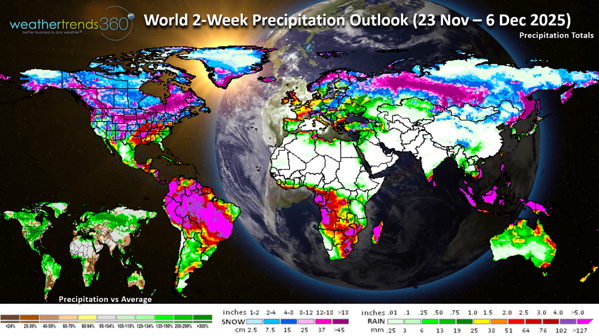 The World 2-week Precipitation Outlook (23 Nov - 6 Dec) shows a very wet and snowy pattern across North America. Brazil also getting much needed rainfall for their crops.